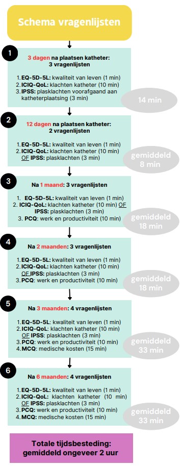 In de eerste 6 maanden na het plaatsen van de katheter, ontvangt u op 6 verschillende momenten vragenlijsten per mail. De totale tijd die u hiervoor nodig heeft, is ongeveer 2 uur. Voor een overzicht van de vragenlijsten kunt u de figuur links uitklappen.